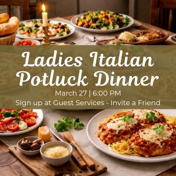 Join us for a fun and festive Ladies’ Mexican Potluck Dinner on Friday, March 27 at 6:00 PM in meeting room 200! Bring your favorite Italian dish to share and enjoy a night of great food, fellowship, and community. All ladies are welcome!